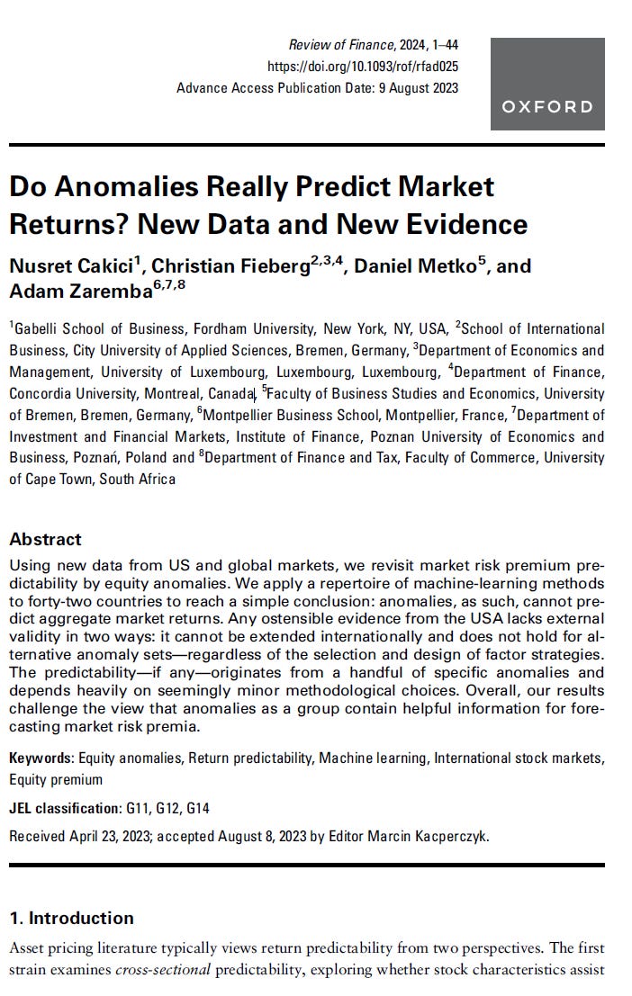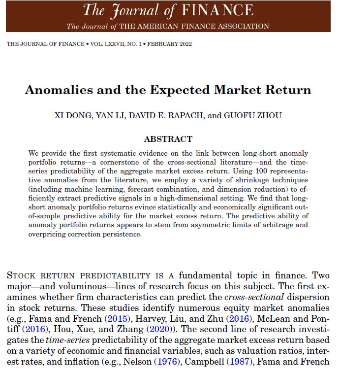 On this issue of Pockets of Predictability, I discuss the 2022 paper “Anomalies and the Expected Market Return”, by Dong, Li, Rapach, and Zhou (DLRZ), as well as the 2024 paper by Cakici, Fieberg, Metko, and Zaremba (CFMZ), who performed a large scale replication of DLRZ using both U.S. as well as global markets data.