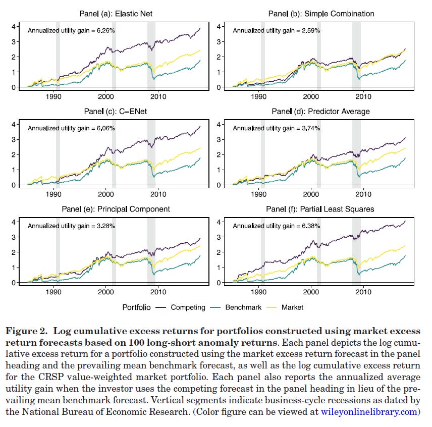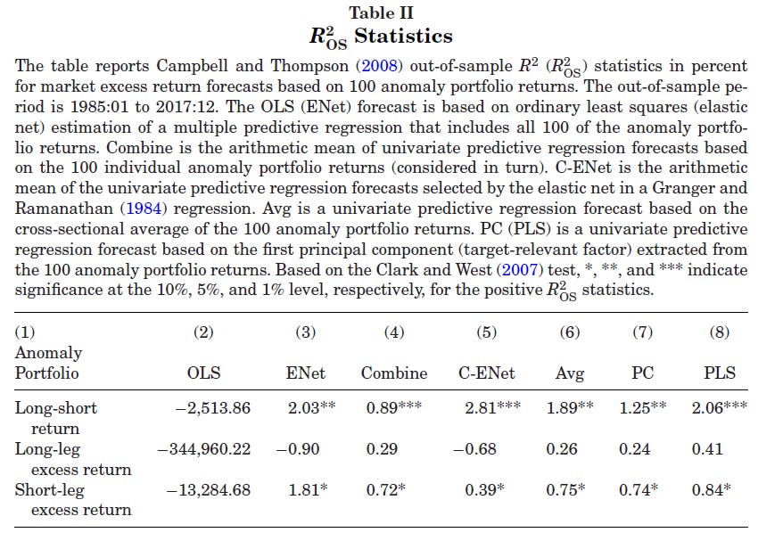 The main results of DLRZ are that the long-short anomalies have strong predictive ability for aggregate market returns. Their main table for statistical performance shows that, while conventional OLS has terrible performance (as expected), several approaches deliver high R2OOS close to 2% or even 3%.